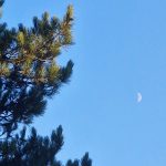 Image ID: Photo of a soft empty afternoon sky with the bristly branches of a scots pine, silhouetted below and brushed with gold above, a pale crescent moon floating in the blue.