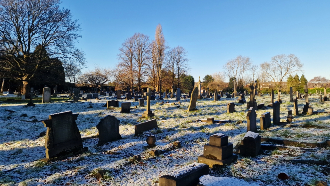 Image ID: Photo of a graveyard thinly stippled with snow beneath a bright blue sky, bare linden and poplar trees and the white ground are touched by a blush of golden light, long indigo shadows stream from every gravestone.