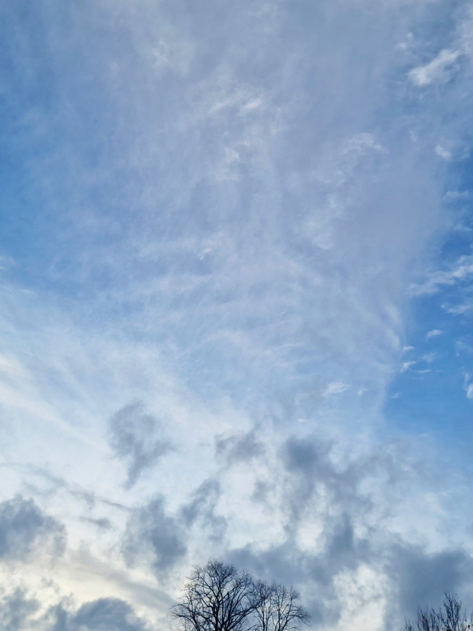 Image ID: Photo of a busy clouded sky, a muted blue layered with striated ripples of hazy translucent grey and a soft swathe of bright white, laying at opposing diagonal angles behind ragged patches of dark iron grey cloud lurking low among the wiry black branches of bare trees.