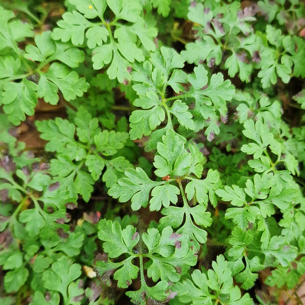 ID: Photo of a patch of herb-robert leaves from above, a green fractal of multiply forked and lobed foliage with rounded cats-paw leaf tips, a few blotched with purple.