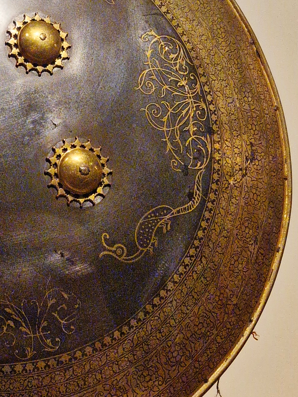 Image ID: Photo of the rim of a round Indian dhal shield, probably from around Lahore in the 18th century, made from satiny silver-grey crucible steel with multiple small domed starbust-edged bosses as well as a broad border of intricate gold floral and foliate patterns, and within that inlaid gold koftgiri designs of scrolling vines and a stylised wide-jawed crocodile.