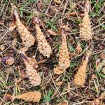 Image ID: Photo of a collection of scots pine cones that have been chewed to the quick, looking like little more than scraps of raw wood bearing spiral grooves, laying on grass thickly layered with forked needle leaves and the severed, teardrop-shaped scales that once hid the seeds within the cones.