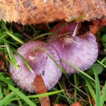 Photo of a pair of lilac fibrecap mushrooms pressed close against each other and tucked slightly under the edge of an orange fallen linden leaf, their glossy caps streaked and blotched with shades of pale pink and purple.