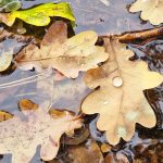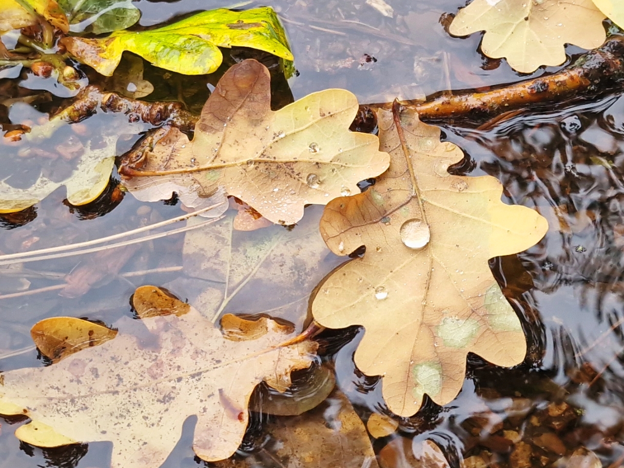 Image ID: Photo of parchment-coloured fallen oak leaves floating on a dark puddle, a single crystalline bead of water resting in the middle of one.