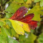 Photo of a deeply lobed hawthorn leaf clinging to the twig, dramatic colouring split almost perfectly between deep burgundy and citric yellow along its central vein, vivid among green foliage.