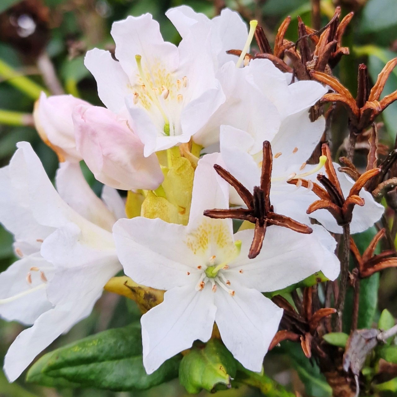 Image ID: Photo of a crisply bright white cluster of rhododendron flowers, large, bold pointed cinquefoils with specklings of vivid yellow on the topmost petals, along with one long, still-closed pale pink bud and the slender curved brown spidery seedpods of last year’s flowers.