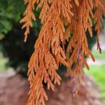Photo of a drooping feathery spray of scaly-leafed lawson’s cypress foliage, starkly bright orange as it wilts in contrast to the deep green of the rest of the tree.