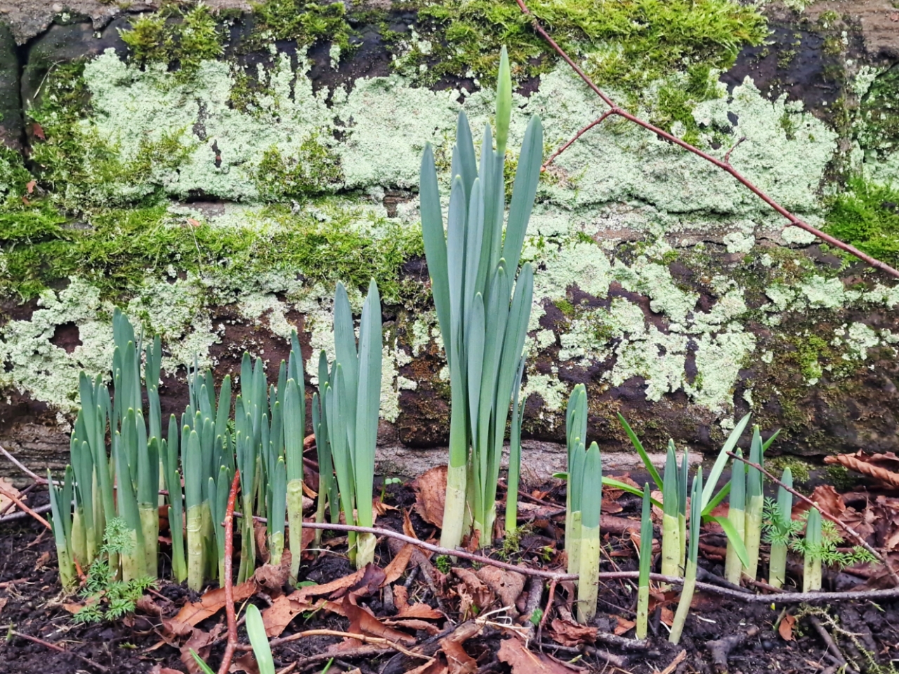 Image ID: Photo of a row of clustered glaucous green shoots with slender pale bases, probably daffodils or similar spring flowers, growing from rusty brown leaf litter close beside a wall of rough stone splotched with moss and pale green lichens.