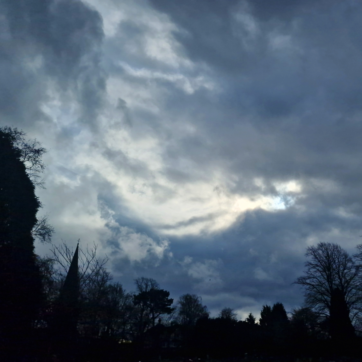 Image ID: Photo of the sky full of swirling plumes of cloud, mostly deep, dark blueish-grey with a broad liquid slash of bright white above the slender black spike of a church spire half-hidden among shaggy silhouetted trees.
