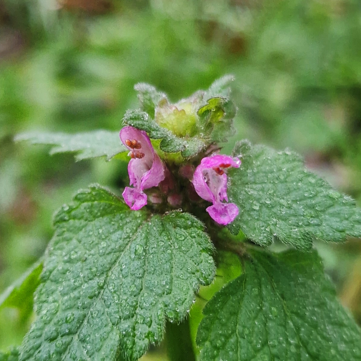 Image ID: Photo of red henbit in bloom, its saw-edged leaves and collar of tiny pink, lobe-lipped tubular flowers densely studded with tiny pinprick raindrops.