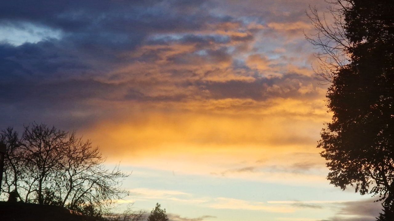 Image ID: Photo of a sunset sky, a pale blue streak along the horizon framed by inky splatters of half-bare silhouetted trees below a towering wall of cloud, a broad bar of glowing amber fading into grey marbled with bruisy indigo and violet as it rises.