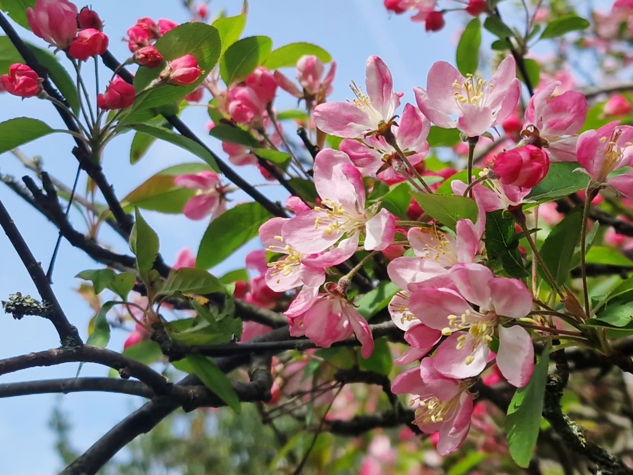 Image ID: Photo of apple tree branches in bloom against a pastel blue sky, green leaves and pale pink cinquefoil flowers, the tips and outsides of the cupped petals matching the vivid deep raspberry pink of their tight-packed buds.