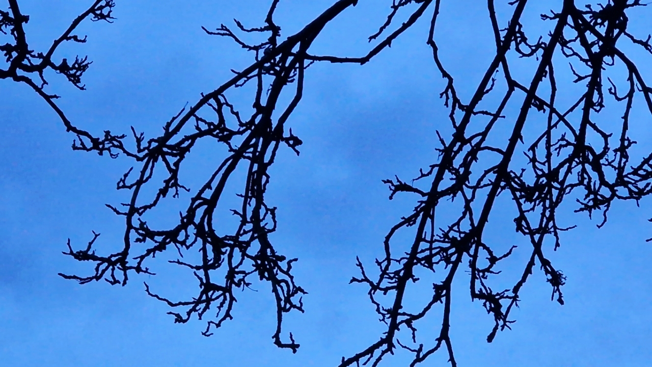 Image ID: Photo of twigs silhouetted against a pale blue sky of dusky cloud cover, a tangle of snarled, knobbly hooks and twists.