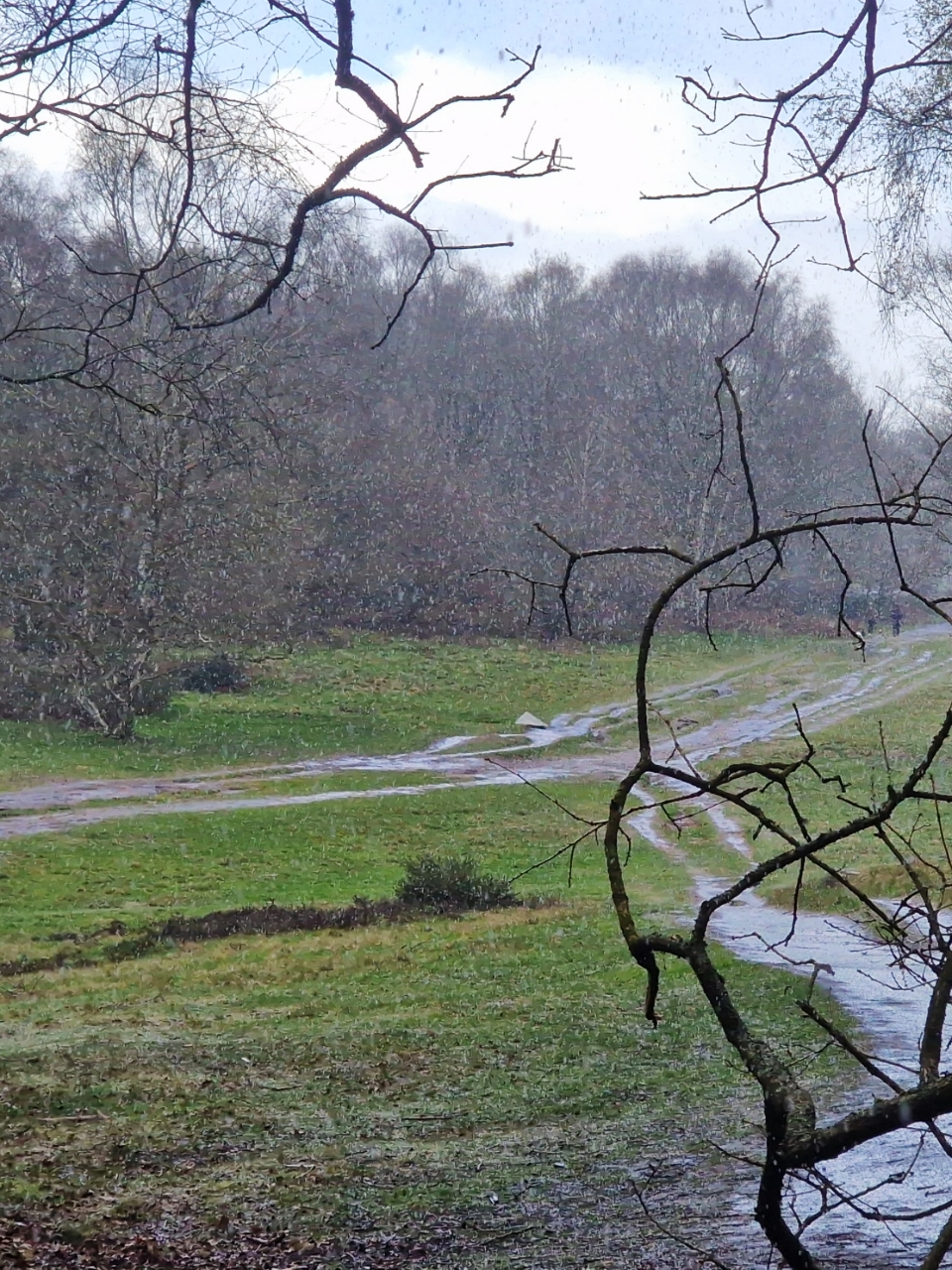 Image ID: Photo of undulating earthen tracks leading up a grassy hillside bordered by a dense thicket of sere trees, the path shining dimly with mud and a haze of tiny white streaks cast across the scene by a torrent of hailstones.