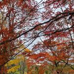 Image ID: Photo of a stand of maple trees, spectacular splashes of crimson and scarlet and gold against green underbrush and a very pale grey sky.