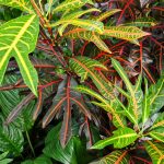 Photo of the long, glossy leaves of variagated croton plants, deeply trident-lobed at the tips, some dark green or near black with crimson veins, others bright green with traceries of yellow.
