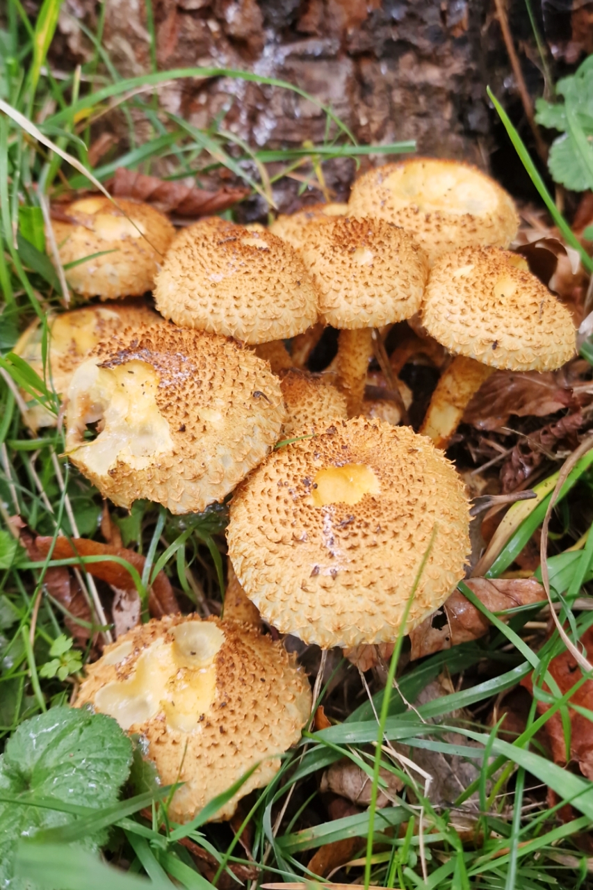 Image ID: Photo of a tiered cluster of mushrooms – possibly shaggy scalycaps – tucked close against the base of a tree trunk, creamy yellow and domed with a ragged, scaled, some of their caps showing signs of being gnawed by squirrels or nibbled by slugs and snails.