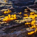 Photo of a beam of sunlight on a fallen log, with short, blunt tendrils of bright yellow fungus, possibly club-like tuning fork, pushing their way from between the grain of the grey wood as if spilling from split seams.