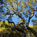 Image ID: Photo of writhing dark oak branches reaching up into a bright blue sky, the foliage partly in silhouette, partly in green and gold motley.