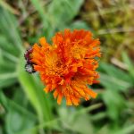 Photo of fox-and-cubs flowers, unusually three in full bloom simultaneously rather than a main flower flanked by smaller opening buds, leading to a single large, shaggy bright orange mass of blunt, serrate-tipped petals pressing against each other.