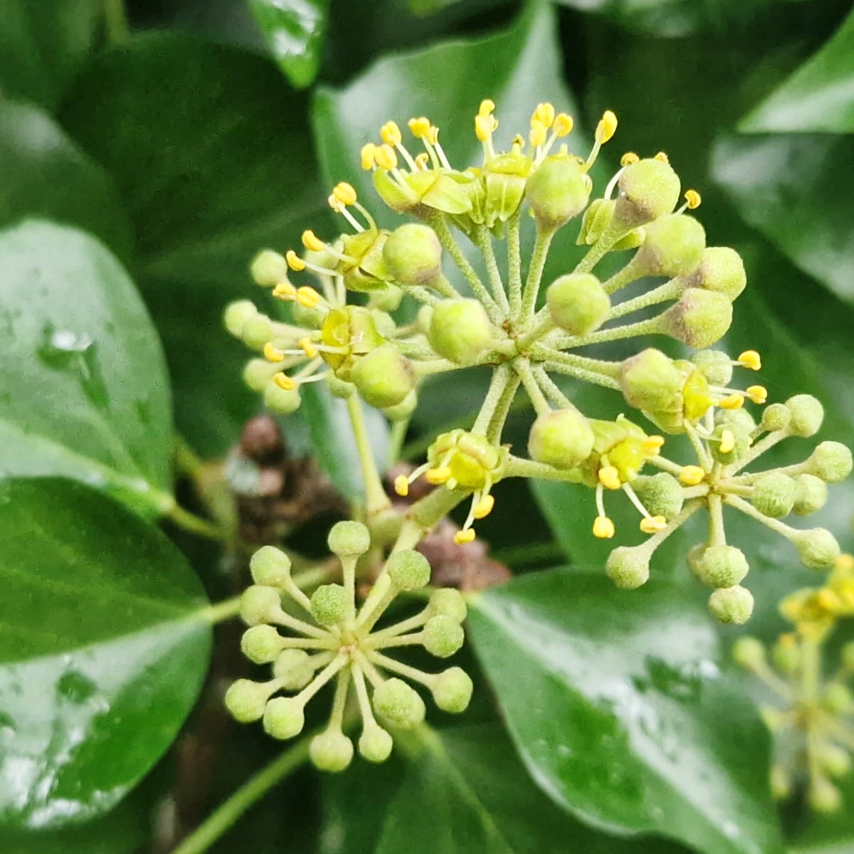 Image ID: Photo of rain-speckled glossy metallic green ivy leaves with a starburst umbel of thin pale green stalks in their midst, each terminating in a round bud that splits open at the tip, revealing five short white stamens and yellow club anthers.