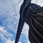 Photo of the monumental sculpture The Angel of the North by Antony Gormley, taken from behind and at an extreme oblique angle, huge wings of dark ribbed steel forming a vast straight diagonal across a cloud-splashed blue sky.