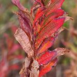 Photo of a willowherb stem, lanceolate leaves crinkled and shrivelling, mostly turnign to brilliant scarlet and crimson edged with hints of deep violet and dry brown.