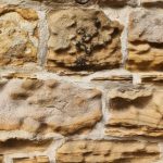 Photo of a thickly-mortared centuries-old wall with a small iron ring set high into it, made from rough sandstone blocks streaked in weather stained shades of pale grey and brown and yellow, surfaces deeply pitted and grooved by wind and rain.