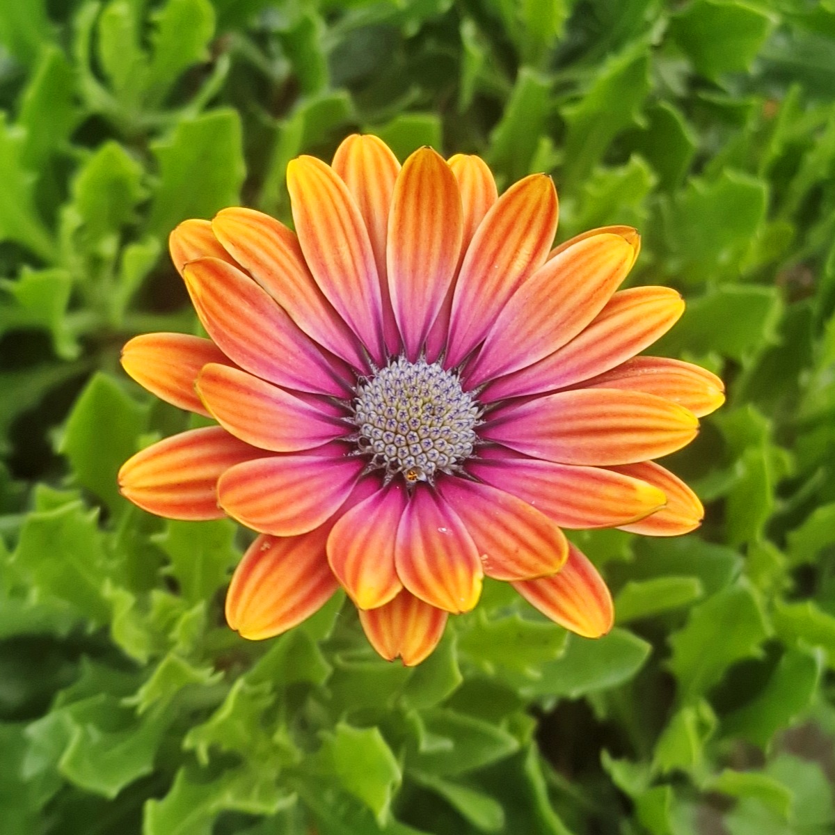 Image ID: Photo of an ornamental African daisy, small grey geometric florets at the centre surrounded by dozens of rounded spatulate petals, deep vivid pink fading into yellow and then orange, streaked with lines of red.