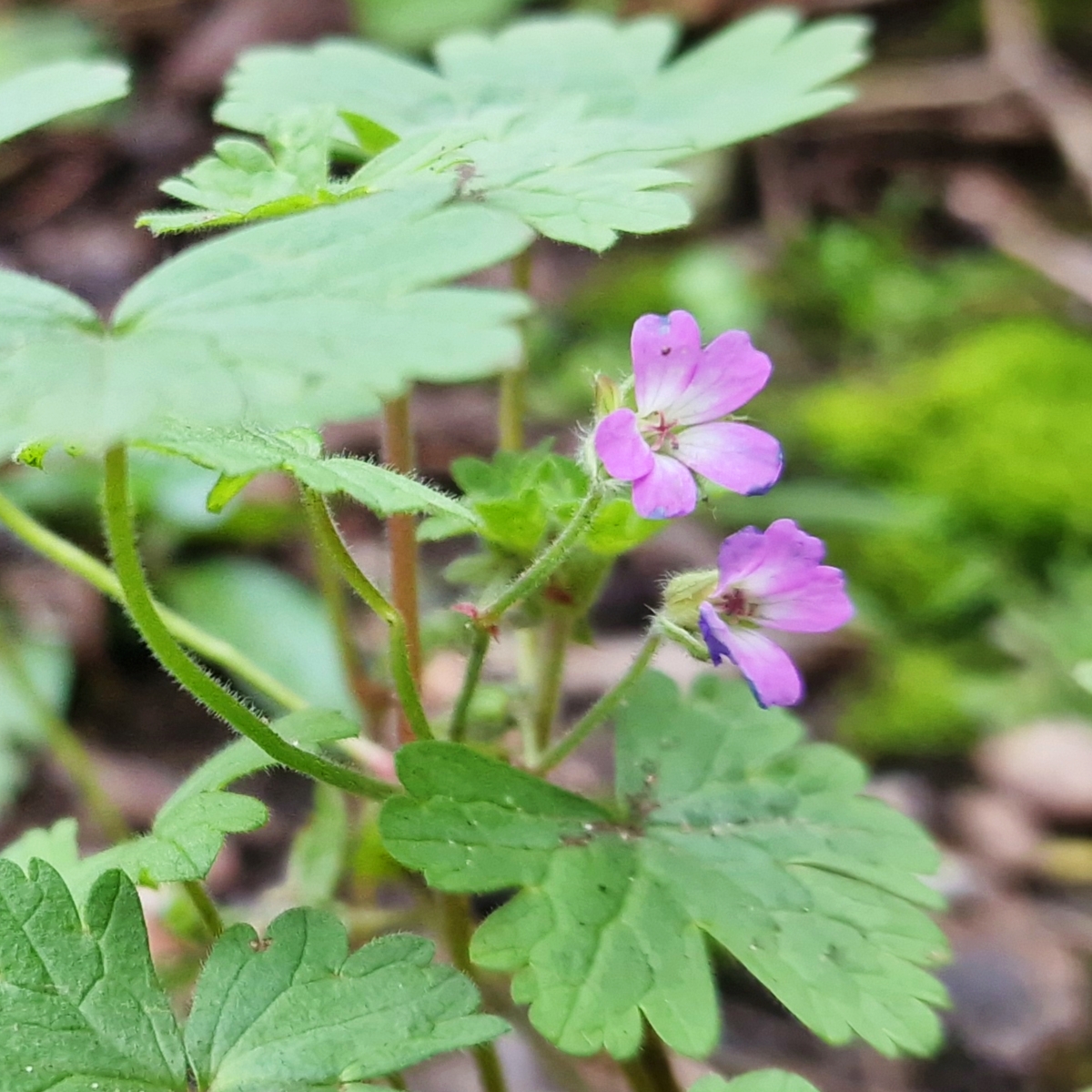 Image ID: Photo of two tiny round-leaved crane’s-bill flowers, bright pink cinquefoils with centres fading to white among layers of broad, lobed leaves, scattered with speckles of soil from their unfolding.