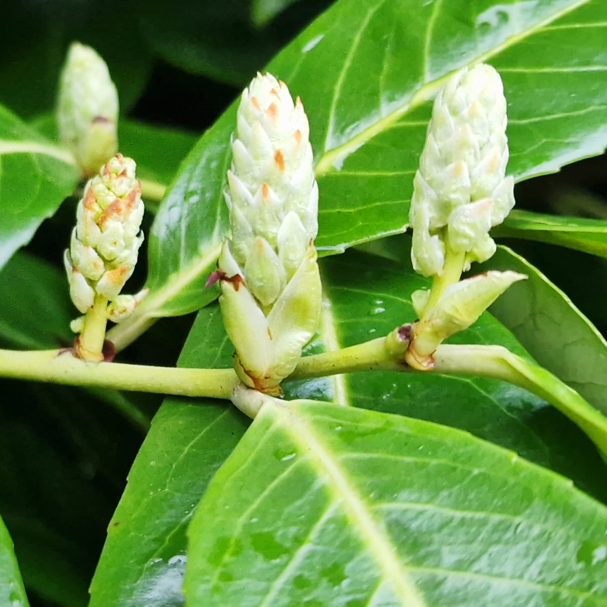 Image ID: Photo of cherry laurel twigs bearing a neat row of very pale mint green compound buds, the scale-like segments of each blunt, compact spike just starting to separate among the large, glossy, leathery green leaves.