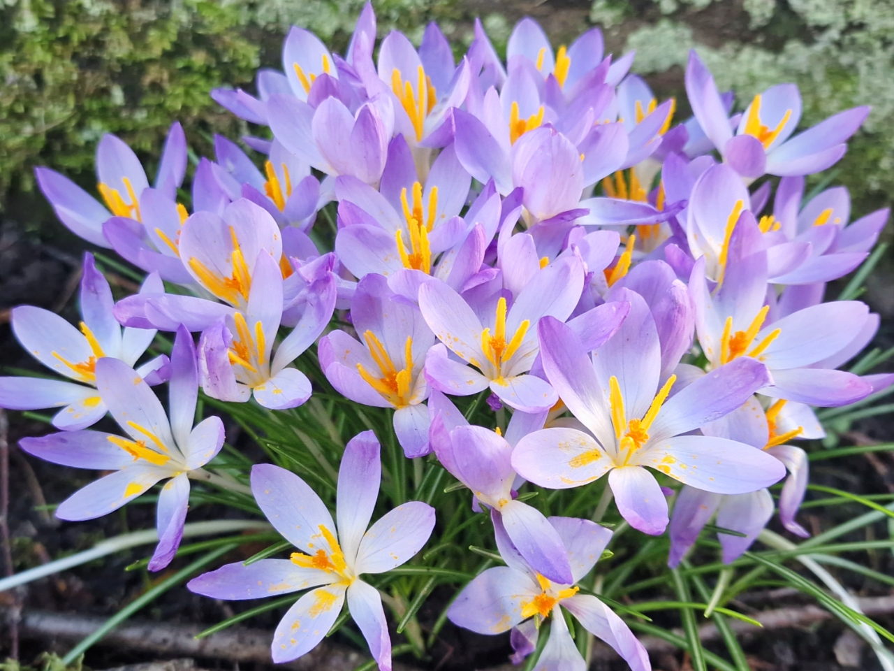 Image ID: Photo of a dense patch of 20 or more pale purple crocuses, fully open and splayed into hexafoil stars with hearts fading to white, framing blazing saffron stamens.