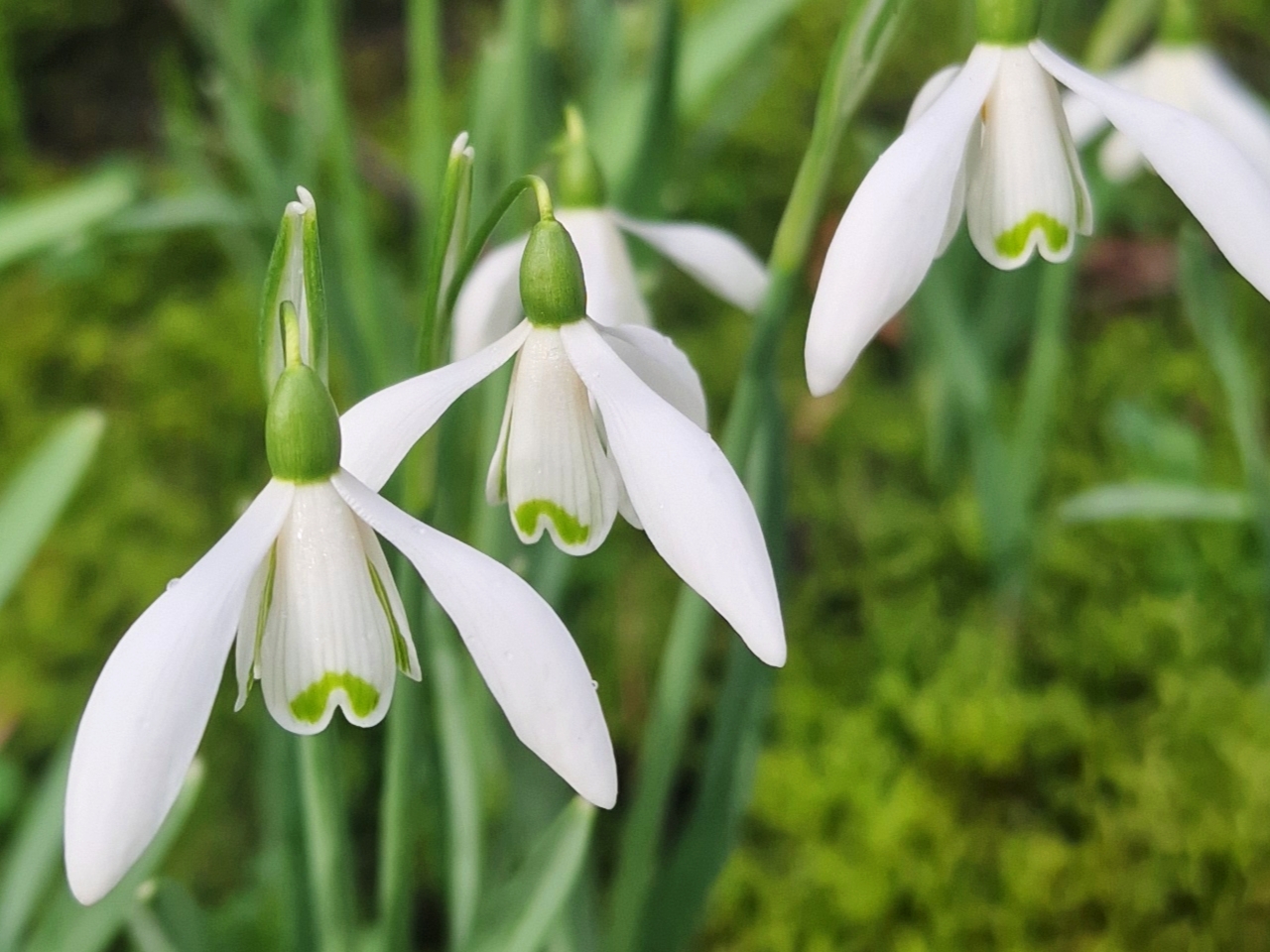 Image ID: Photo of snowdrops in full flower, a patch of bright white pendulous blooms with three long, drooping separated outer tepals and an inner ring of three much briefer tepals with green markings near their bilobed tips.