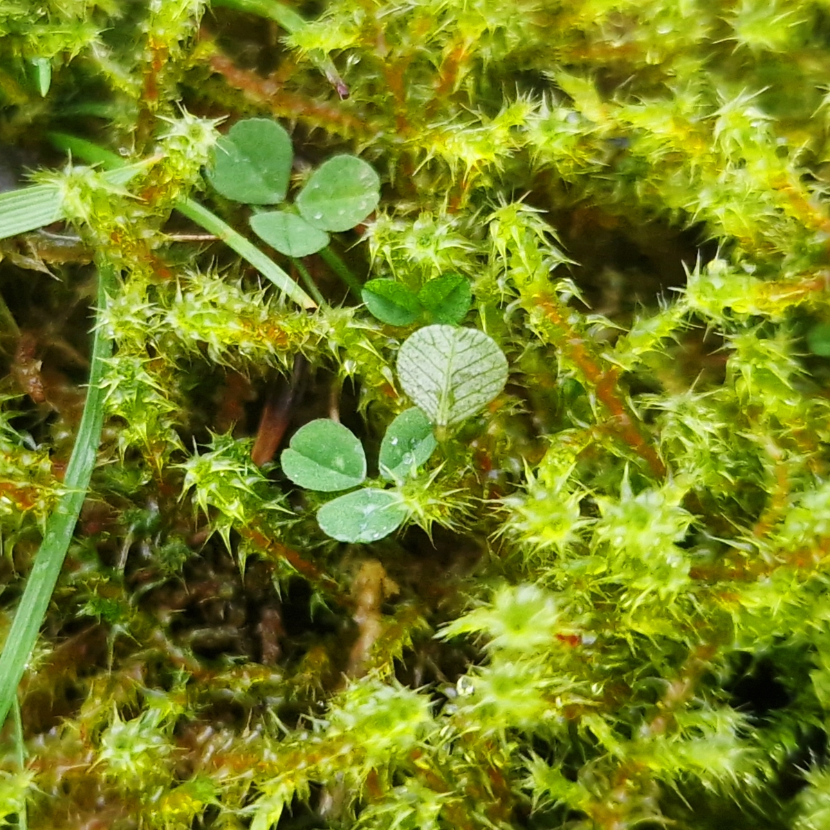 Image ID: Photo of a bed of jade green turf-moss, tiny wooly fronds soaked and spiky with water, a few rounded chickweed leaves nestled among its trailing stems.