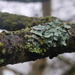 Photo of a grey tree branch, patchily furred with moss and with a scaly young growth of pale mint green oakmoss.