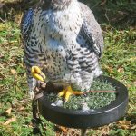 Photo of a peregrine falcon jessed to a small stand staked into grass, its white breast ticked and barred with black, standing on one bright yellow taloned foot.