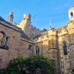 Image ID: Photo of the crenellated roofline of a castle courtyard, with the yellow-speckled canopy of a small tree in shadow below, while a stripe of warm golden morning light falls across sandstone towers against a bright blue sky.