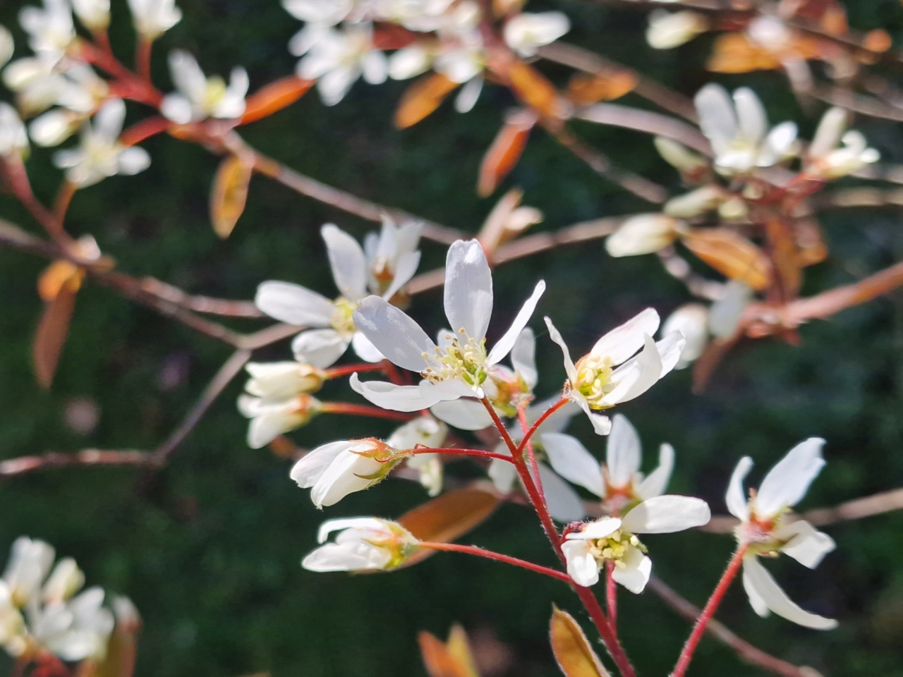 Image ID: Photo of serviceberry tree twigs coming into bloom, caught by bright sunlight against shadowed grass, white cinquefoils among coppery leaves and slender red stems with long, fine separated petals.