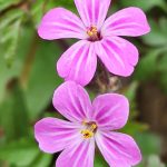 Close-up photo of a pair of herb-robert flowers, small cinquefoils with bright pink petals striped in white and deeper more plummy pink, tight bundles of yellow anthers at their centres.
