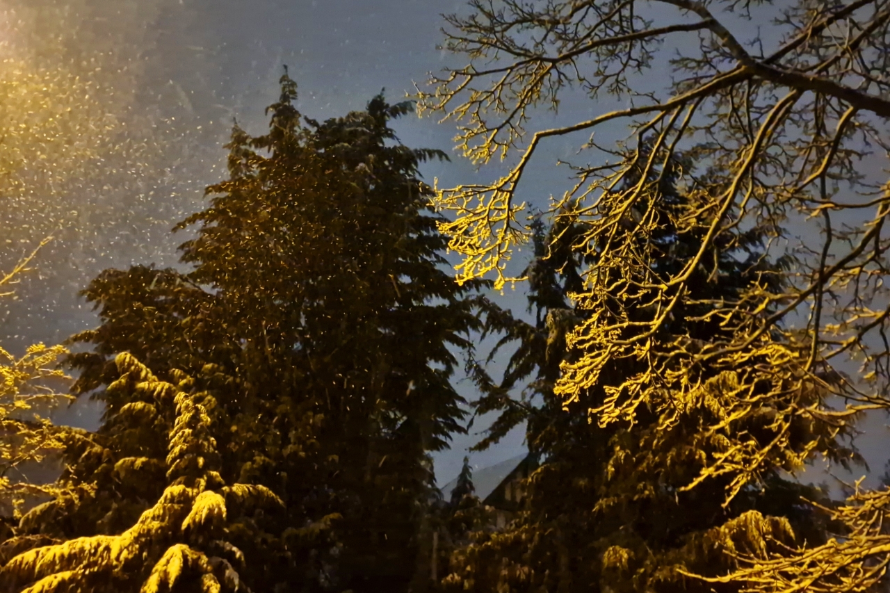 Image ID: Photo of flurries of snow standing out against a dull slate blue night sky and silhouetted pine trees, in the foreground bare black branches and the feathery plumes of a lawson’s cypress are both weighed down by a caking coat of snow, dyed smoky orange by electric light.