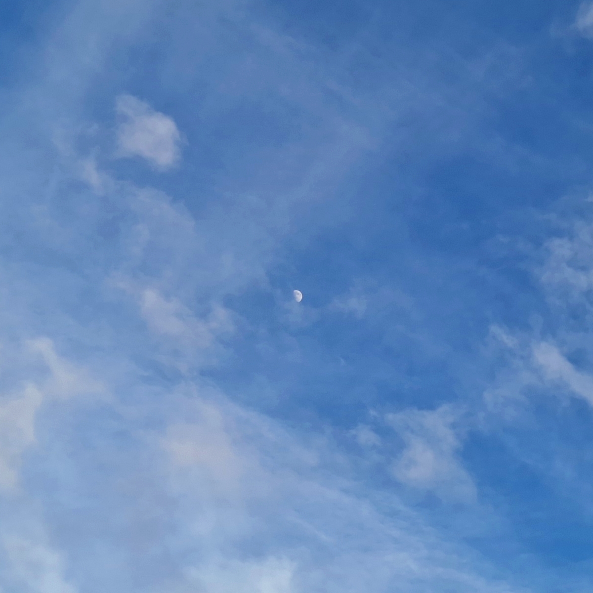 Image ID: Photo of the sky, blue veiled and softened by very thin, diffuse and swirling layers of cloud, the bright white fleck of the waxing moon in the centre of the frame.