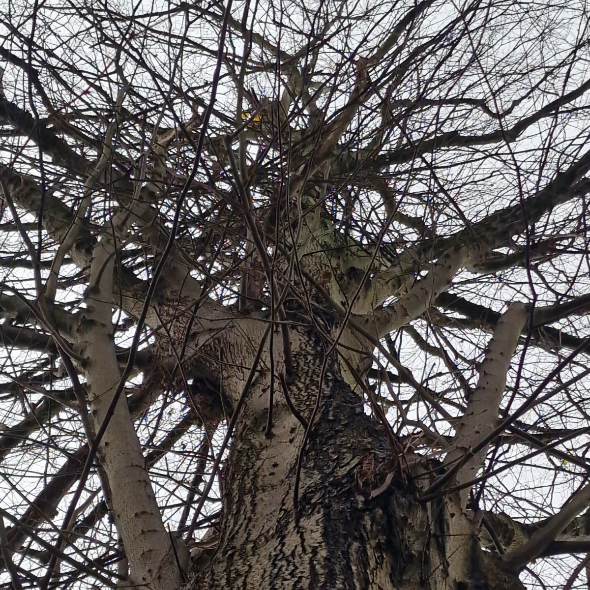 Image ID: Photo of the tall, scarred and writhing trunk of a leafless linden tree, an inkblot explosion of stiff branches dividing into a scribbled chaos of wiry twigs against a dim pale grey sky.