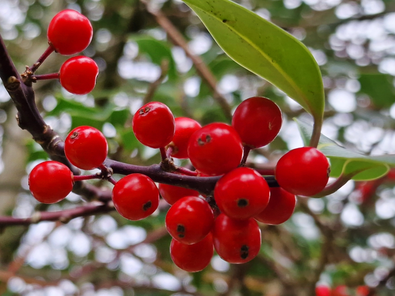 Image ID: Photo of a cluster of fully-ripe holly berries, vivid scarlet, glossy as if freshly lacquered and polished.