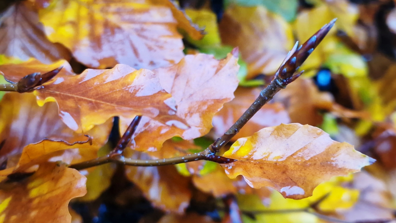 Image ID: Photo of the rain-glossy orange and yellow leaves of a beech hedge, grey light reflecting from corrugated angles formed by stiff chevron veins, among them already next springs buds like in wait, a long mahogany spike among the foliage formed from slender blue-tipped scales.