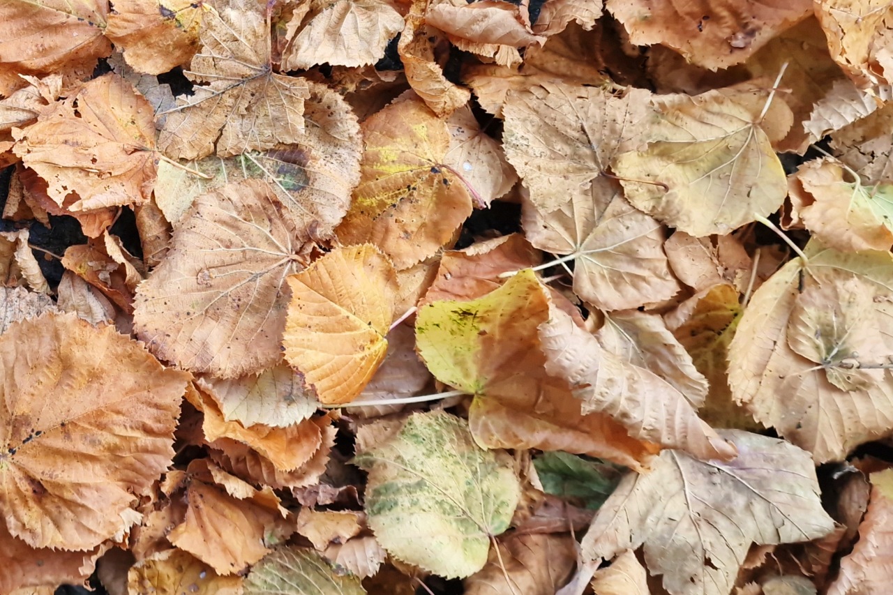 Image ID: Photo of a carpet of mostly heart-shaped linden leaves, curled and tattered, in dozens of shades of orange, yellow, and pale parchment brown.